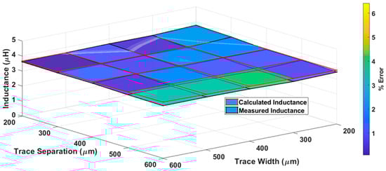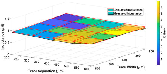 The measured inductances (black lines) and proposed model inductances (red lines) with color bar graphs for various trace separations and trace width are represented graphically in Figure 8. It is evident from Figure 8 that the proposed model inductance and measured inductance values are approximately the same, with a percentage difference of less than 5% between the values. This difference is primarily associated with fabrication inaccuracies and measurement errors.