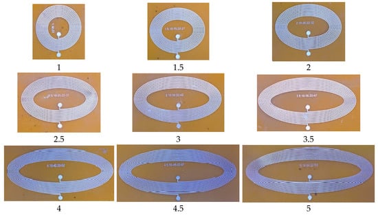 To investigate the effect of the varying major-to-minor ratio between one and five, elliptical inductors of different sizes were fabricated and tested, as shown in Figure 11. In all planar inductors, the number of turns, trace width, and trace separation were kept fixed at 10, 200 μm, and 200 μm, respectively. The inner minor diameter was set to 5 mm, while the inner major diameter was varied from 5 to 25 mm to achieve major-to-minor ratio (R) values of between one and five. The numerical inductance is calculated using the proposed model mentioned in Section 2.1, whereas the measured inductance () is measured using the impedance analyzer. The numerical inductance of the proposed model and measured inductance values are listed in Table 8. To calculate the difference between the numerical inductance of the proposed model and measured inductance values, the absolute percentage error has been calculated and is tabulated in Table 8.