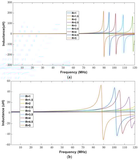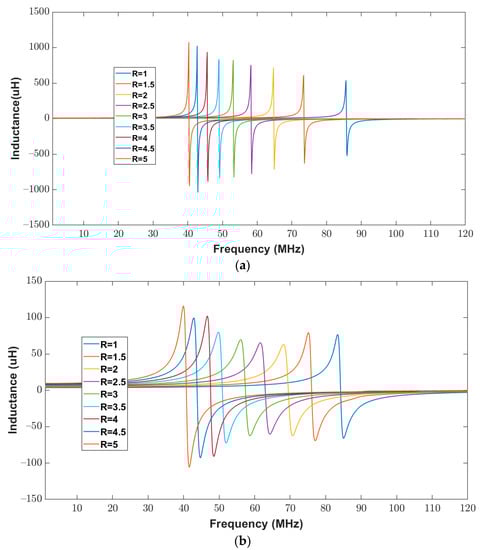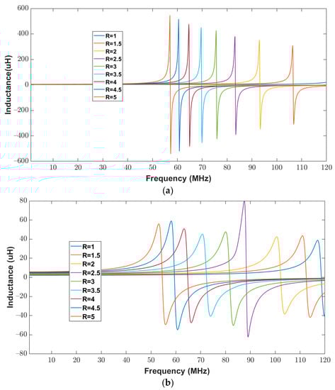 For further validation, the inductance of the elliptical inductor was computed and measured for a frequency range of 20 Hz to 120 MHz. Figure 16a,b show the calculated and measured inductance of elliptical inductors, respectively. It can be observed from Figure 16 that for all combinations of major-to-minor ratio values (one to five), the trends in the measured and the calculated inductance results look similar.