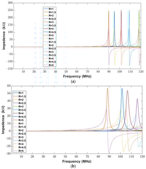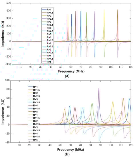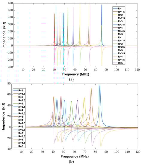 The real and imaginary impedance components are shown in Figure 17a,b when the trace width and trace separation were kept constant at 400 μm for varying major-to-minor ratio values of between one and five. It is evident from Figure 17a,b that there was a similar response for the calculated and measured impedances of elliptical inductors.