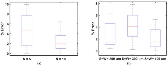 (a) Boxplot of the percentage error when trace width and separation were varied between 200 μm and 600 μm for fixed major-to-minor inner diameter ratio (R) = 3 for number of turns N = 5 and N = 10 (b).