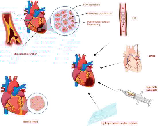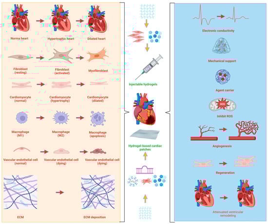 There are two main approaches to cardiac regeneration based on hydrogels: injectable hydrogels and hydrogel-based cardiac patches [98]. Injectable hydrogels are used to deliver bioactive compounds and cells to the myocardial wall for in situ repair and regeneration, and hydrogel-based cardiac patches provide mechanical support to the myocardial wall, inhibiting ventricular enlargement passively [99]. An injectable hydrogel patch is an emerging approach that hybrid injectable hydrogels and cardiac patches facilitate cardiac neovascularization and regeneration [48,98]. In order to repair damaged myocardium, a hydrogel patch must be surgically sutured to the epicardial surface. A growing interest has been generated in injectable hydrogels for the treatment of MI due to their ability to precisely enter and fill inaccessible tissue sites and pathological sites to repair damage (Figure 3).