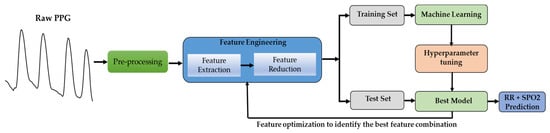 This research is divided into four main sections. In Section 1, we present an introduction to PPG and its application for RR and SpO2 estimation, as well as a brief survey of the existing literature in this area. In Section 2, we detail the dataset, preprocessing stages, feature extraction, feature selection, evaluation matrices, and ML models. The experiment results and their significance are presented and discussed in Section 3. In the same section, the results of this work are compared to those of state-of-the-art approaches. The entire study is summarized in Section 4.