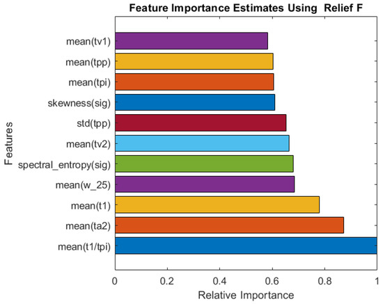 A comparison of the relative importance of the features selected by the Relief algorithm is shown in Figure 5. The algorithm selected a good combination of frequency-domain and time-domain (PPG and derivative of PPG), as well as statistical features, similar to Fitrgp for RR. It is found that the mean of the ratio of the systolic peak time (t1) to the pulse interval (tpi) is the most important features.