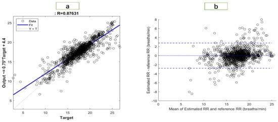 Figure 6 and Figure 7 illustrate the results of the most accurate model for RR and SpO2, respectively. A regression plot and a Bland–Altman plot were used to visualize the data. The predictions were plotted against the ground truth (target) in a regression plot. In this example, two lines were drawn: one represented the ideal result in which all the targets were accurately predicted; the other represented the realistic result. A trendline of the data was also plotted. Generally speaking, the closer the trendline is to the y = x line, the better the model will be.