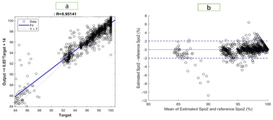 Visualization of the results for SpO2 with (a) a regression plot (b) a Bland–Altman plot.