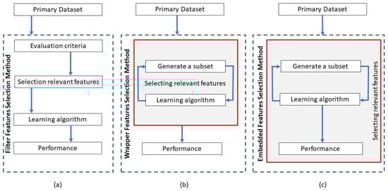 Information flow in the three primary categories of feature engineering methods: (a) filter, (b) wrapper, and (c) embedded methods [62].