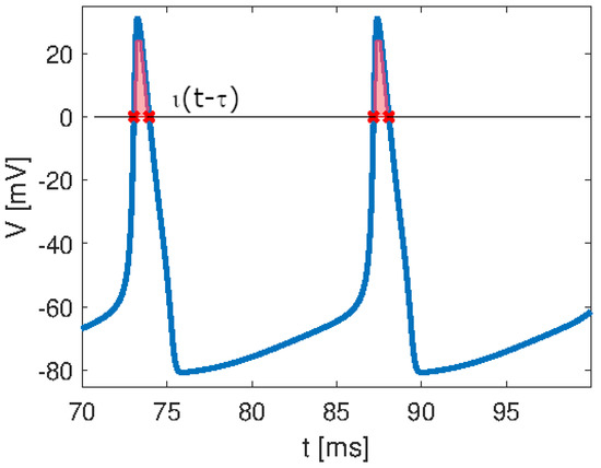 Spiking signals are, therefore, ubiquitous as they are present in very different scenarios. They are the bases of neural information transfer. In order to provide a formal characterization of a spiking signal, an analogy with the Dirac impulse can be performed [3]. The Dirac impulse is defined as a pulse of infinite magnitude occurring at the instantaneous time , thus having an integral area equal to 1. Analogously, a single spike, which in general is associated with the action potential of a biological neuron, can be defined through the function that assumes the value of the spike only when it overcomes a given threshold, as schematically reported in Figure 5. The integral area of the spike, i.e., the shaded region in Figure 5, is equal to , analogous to the function, where a is called the sensitivity of the neuron. Therefore, a spiking signal is analogous to an impulse train, with the latter consisting of pulses of infinitesimal duration and the former consisting of spikes of finite duration.
