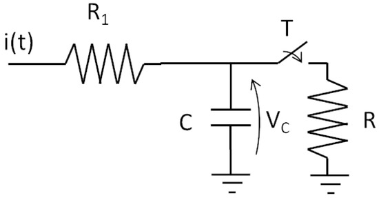 Researchers have focused on obtaining suitable models since the beginning of the last century. In fact, Lapique, in 1907 [4], developed a model of a neuron considering only the electrical behavior of an active membrane. The study paved the way for advanced models of spiking neurons. The Lapique model was conceived as an electrical circuit with one capacitor and two resistors, as shown in Figure 6.
