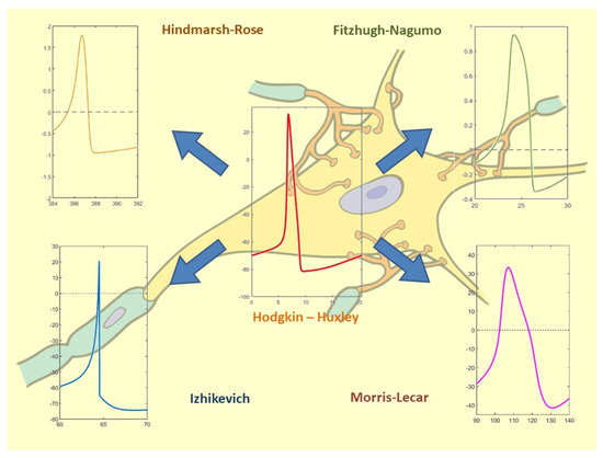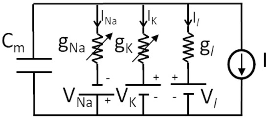 Studies by Hodgkin and Huxley (HH) [8] allowed establishing the first biophysically complete dynamical model of a neuron, where membrane conductance was explicitly considered to generate action potentials. It was derived from experimental studies on giant nerve fibers and based on the nonlinear electrical scheme presented in Figure 7, providing an accurate mathematical model.