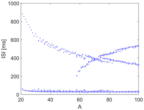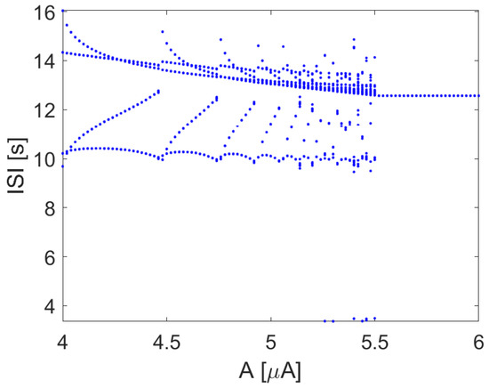 When the input current I is a sinusoidal signal with constant frequency, varying the amplitude A leads to the bifurcation diagram, as reported in Figure 9, showing the emergence of complex patterns of spiking, including windows of chaotic behavior.