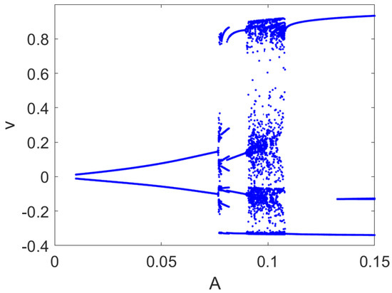 Bifurcation diagram of the FHN model. Local maxima and minima of the variable v are reported for each value of A with rad/s. Other parameters: , .
