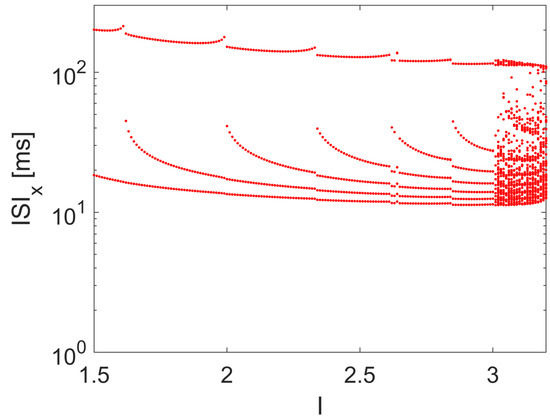 ISI bifurcation diagram of the HR model with respect to I. Other parameters: , , , , , , and .