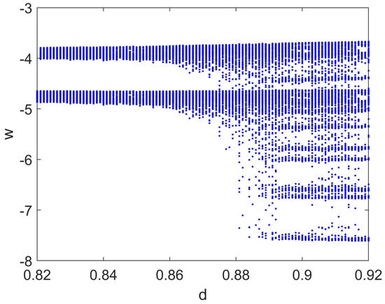 Bifurcation diagram of the Izhikevich model with respect to parameter d. Other parameters: , , , , , rad/s.