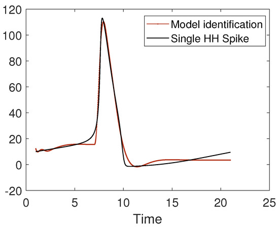The problem of parameter estimation in a spiking neuron model can be approached with several techniques, including nonlinear autoregressive models [55]. In Figure 15, we present the identification with a nonlinear model of a single Hodgkin–Huxley spike.