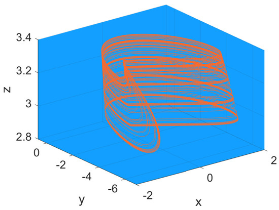 Chaotic attractor in the Hindmarsh–Rose model (6) with parameter values: , , , , , , , and .