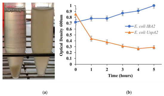 Illustration of a sedimentation assay. (a) Macroscopic analysis of auto-aggregation. Within a few minutes, Escherichia coli UspA2 (left tube) aggregates and settles at the bottom of the tube under static incubation, whereas the control culture of E. coli carrying the empty vector pASK IBA2 (E. coli IBA) (right tube) remains turbid. (b) Measurement of auto-aggregation. Culture samples were incubated statically and the OD600nm value at the top of the culture tube was measured after 5 min of incubation. The reduction in turbidity at the top of the culture is a function of the OD600nm value. Auto-aggregating bacteria settle at the bottom of the tube, resulting in a loss of turbidity (orange curve), whereas in negative control culture samples the reduction in turbidity is negligible (blue curve).