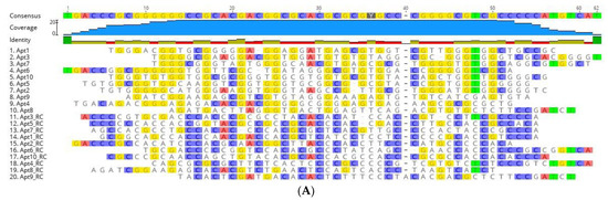 NGS results were further analyzed using the bioinformatics tool Geneious. Of the 7,788,762 sequences retrieved by NGS, 1,210,938 sequences remained after an initial filtration, the removal of the constant primer binding and adapter segments and removal of sequences outside the desired length (46–52 nt). Geneious was used to refine the sequences to obtain the 10 most repeated oligonucleotide sequences and their RC sequences, presented in Table 2 (displaying only the randomized region). The RC sequences were also considered, since PCR was used to amplify the ssDNA pool after each cell-SELEX cycle, causing the reverse complementary sequences to be introduced to the evolving aptamer pool in the following cycles and thus introducing the possibility that some of these RC aptamers could exhibit high-affinity to UspA2 and be retained in the final pool. Therefore, 20 sequences, namely the top 10 sequences and their RC, were further aligned to evaluate their homology within their variable core region (Figure 2A). Alignment of the N50 aptamer regions revealed limited homology and conservation. This suggests that most of these aptamers had unique binding sites on the target UspA2. A distribution of a high number of Gs in the forward sequences and Cs in the reverse complement sequences of the random regions is evident.