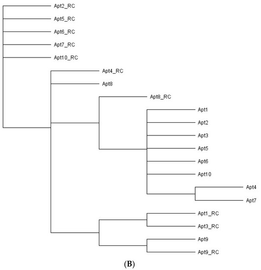 Analysis with regards to the phylogenetic relationship revealed that the selected aptamer sequences showed a distinct evolutionary tree (Figure 2B), where seven main families of related aptamers were identified (Apt1_RC and Apt3_RC; Apt1, 2, 3, 5, 6, and 10; Apt2_RC, Apt5_RC, Apt6_RC, Apt7_RC and Apt10_RC; Apt4_RC and Apt8; Apt9 and Apt9_RC; Apt8_RC; Apt4 and Apt7), showing that they do not have a very similar sequence for conserved nucleotides between them.