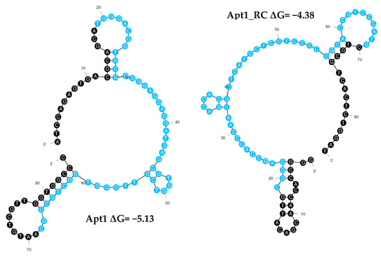 Secondary structures of finalized candidate aptamer sequences obtained from cell-SELEX. The Mfold web server was used to predict the secondary structures of Apt1 and Apt1_RC selected for in vitro characterization. To calculate the Gibbs free energy of the aptamer sequences, the constant primer regions were considered at 37 °C, 187 mM Na+ and 1.4 mM Mg2+. Random and primer regions are presented in blue and black, respectively.