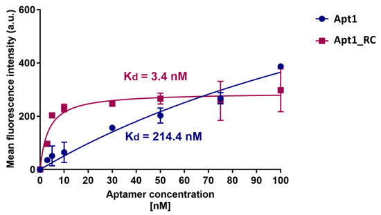 Determination of the equilibrium dissociation constant of candidate aptamers Apt1 and Apt1_RC. The titration curves of each aptamer with E. coli UspA2 cells are shown. The aptamers were labeled with fluorescein (FAM) and fluorescence was assessed with a fluorescence spectrophotometer. (nM) values were calculated using GraphPad Prism 7, set to a non-linear fit model with one-site non-competitive binding to the fluorescent population ratio at the given aptamer concentrations. a.u = arbitrary units.