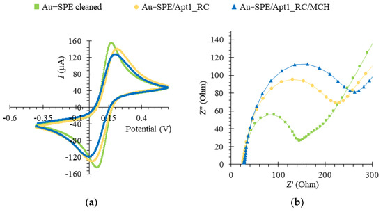 Electrochemical assays to assess the assembly of the aptasensor upon functionalization of the Au-SPE surface, in 5.0 × 10−3 M [Fe (CN)6 ]3− and 5.0 × 10−3 M [Fe (CN)6]4− solution, prepared in phosphate buffer, pH 7.4. Cyclic voltammetry (CV) (a) and electrochemical impedance spectroscopy (EIS) represented by a Nyquist plot (b).