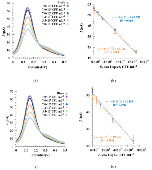 Electrochemical assays to assess the analytical response of the aptasensor in square wave voltammetry (SWV) (a,c), and the corresponding calibration curves (b,d), in 5.0 × 10−3 M [Fe (CN)6]3− and 5.0 × 10−3 M [Fe (CN)6]4− in phosphate buffer, pH 7.4. The aptasensors functionalized with Apt1_RC were incubated sequentially with increasing concentrations of inactivated Escherichia coli UspA2 cells in a buffer at pH 5.0 (a,b) or at pH 7.4 (c,d). The orange and blue plot lines (b,d) represent calibration curves performed on different days.