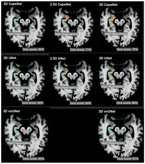 Examples of 3D, 2.5D, and 2D segmentations of the right hippocampus by CapsNet, UNet, and nnUNet. Target segmentations and model predictions are respectively shown in green and red. Dice scores are provided for the entire volume of the right hippocampus in this patient (who was randomly chosen from the test set).