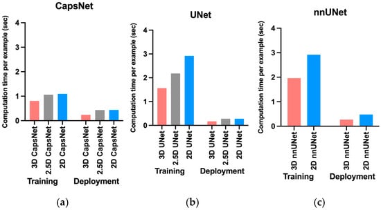 Fully-trained 3D models could segment brain MRIs faster during deployment compared to 2.5D or 2D models (Figure 4). Fully-trained 3D, 2.5D, and 2D CapsNets could respectively segment a brain MRI in 0.2, 0.4, and 0.4 s. Fully-trained 3D, 2.5D, and 2D UNets could respectively segment a brain MRI in 0.2, 0.3, and 0.3 s. Lastly, fully-grained 3D and 2D nnUNets could respectively segment a brain MRI in 0.3 and 0.5 s. Therefore, fully-trained 3D models segmented a brain MRI 30% to 50% faster compared to fully-trained 2.5D or 2D models.