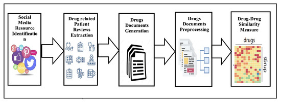 The task of computing drug-drug similarity can be viewed as a use case of the general task of drug knowledge discovery that is concerned with extracting insights from available data. The five key stages of the standard approach for extracting drug-related datasets from social media [10] are: (1) resource selection, (2) dataset extraction, (3) data preparation, (4) data analysis, and (5) overall evaluation. The main elements of the process are frequently preserved, even though the specifics of each step may change depending on the final application. Figure 1 depicts the specific use case of the general drug knowledge discovery methodology that is concerned with computing drug-drug similarity from social media platforms.