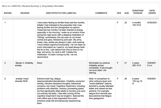 Snapshot of patients’ reviews extracted from Askapatient.com (accessed on 2 January 2023) for Lamictal (Lamotrigine).