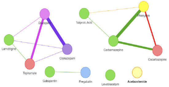 To evaluate the discovered similarity-based correlations among AEDs, it is meaningful to compare the obtained similarity from social media with the AEDs similarities that are based on drug-centric data mentioned above. For this sake, this research uses the DrugSimDB [45] tool which integrates multiple sources of drug-centric data to compute DDS among a comprehensive list of drugs. It includes 238,635 significant multi-modal DDS for 10,317 small-molecule medications that are either unlawful or withdrawn (2466 approved and 7212 investigational). DrugSimDB uses a variety of public datasets. This covers protein sequences and their functional annotations, drug-induced pathways, chemical structure descriptors, interactions between proteins and proteins and between drugs, to determine the degree to which each combination of medications has the same targets, structures, activities, and routes. DrugSimDB is a web-based application that enables users to browse or download the complete drug database or any crucial processed files. Table 13 presents the results of AEDs similarities obtained from DrugSimDB and Figure 3 shows their representation as a network.