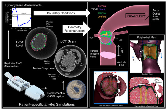 The link between thrombosis in TAVR and PVL was initially investigated in several in silico computational fluid dynamics (CFD) simulations [22,23,24,25]. PVL has been replicated with a patient-specific in vitro flow model, giving the ability for further in-depth study of the clinical scenarios for device comparison [26,27,28]. The in silico models have relied on initial structural finite element simulations to estimate deployment of the TAVR device in the patient anatomy, and the resulting PVL channels could only be compared to echo/Doppler imaging which is limited in resolution and accuracy of flow velocity [23,24,26]. These studies have utilized device thrombogenic emulation (DTE) methodology in which a particle model is used to estimate platelet trajectories, and stress accumulation along the trajectory is collapsed into a probability of device thrombogenicity or the device thrombogenic footprint [29,30,31,32]. In these studies, platelets were seeded in the blood flow field during diastole, and their individual trajectories were tracked over a single wash through the channels–indicating a significant increase in the device thrombogenic potential due to the leak [23,24,25].