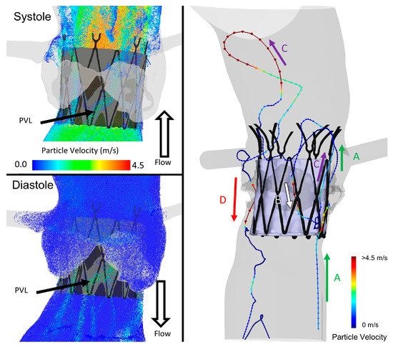 Evidence of platelet entering and reentering in both flow phases—Left shows platelets entering the PVL channels of Anatomy A in both systolic phase and diastolic phase. Right shows a pathline of platelet from (A) entering the channel in systole, (B) reentering in diastole and recirculation for another cycle, (C) exiting in 3rd systole into the aorta, and finally (D) washing through the PVL channel in the final diastolic phase.