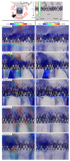 The following supporting information can be downloaded at: https://www.mdpi.com/article/10.3390/bioengineering10020188/s1, Supplementary Figure S1: Three views of top 3000 highest SA platelet pathlines colored by velocity; Supplementary Figure S2: Three views of top 3000 highest SA platelet pathlines colored by stress magnitude; Supplementary Figure S3: Polar projections of the diastolic streamlines; Supplementary Figure S4: Three views of the diastolic streamlines colored by velocity magnitude; Supplementary Figure S5: Three views of the diastolic streamlines colored by shortest distance to a wall boundary; Supplementary Figure S6: Example complex platelet trajectories in each anatomy; Supplementary Figure S7: PDF comparison versus injection time; Table S1: Linear correlations between hydrodynamic parameters and the thrombogenic indicators; Video S1: Animation of 1 million platelets from Anatomy A colored by velocity and stress magnitude with polar projections; Video S2: Animation of 1 million platelets from Anatomy B colored by velocity and stress magnitude with polar projections; Video S3: Animation of 1 million platelets from Anatomy C colored by velocity and stress magnitude with polar projections; Video S4: Animation of 1 million platelets from Anatomy D colored by velocity and stress magnitude with polar projections; Video S5: Animation of 1 million platelets from Anatomy E colored by velocity and stress magnitude with polar projections.