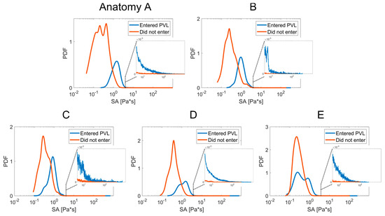Probability density function (PDF) of the platelets stress accumulation (SA) comparison —Showing the increased stress accumulation of platelets entering the PVL channels (blue peaks shifted right). Inset graph highlights higher stress values (>5 Pa × s). Each PDF represents the patient-specific anatomies (A–E).
