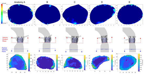 Contour plots of LVOT velocity and concentration of platelets entering the PVL domain—Top are velocity contour plots in the LVOT perpendicular to the bottom of the TAVR stent. Bottom contours represent the concentration of the starting position of the PVL platelets in the LVOT, showing concentrations towards the lumen surface. Each column represents the patient-specific anatomies (A–E).