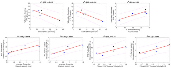 Emerging linear trends from the 5 cases—Top row—linear correlations showing the tendency of platelets to enter or reenter the PVL channels. Bottom row—linear correlations of the median and mean stress accumulation of the PVL platelets to the diastolic streamline velocity and the average velocity (>0.3 m/s) in a transverse plane of the LVOT.