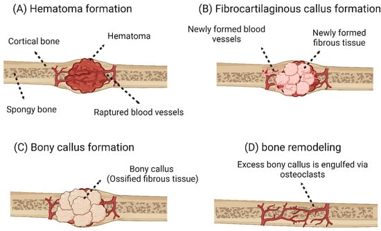 Main stages of secondary bone healing. (A) A hematoma forms after the fracture. (B) In the first stage of regeneration, the fibrin is gradually replaced by fibrous-cartilaginous tissue forming woven bone. (C) At a later stage of the regeneration phase, ossification of the cartilaginous tissue occurs, and more neocartilaginous tissue is formed. (D) Once the bone has grown back together over bony calluses, the original morphology of the bone cortex is restored by remodeling [48]. The image was created using Biorender.