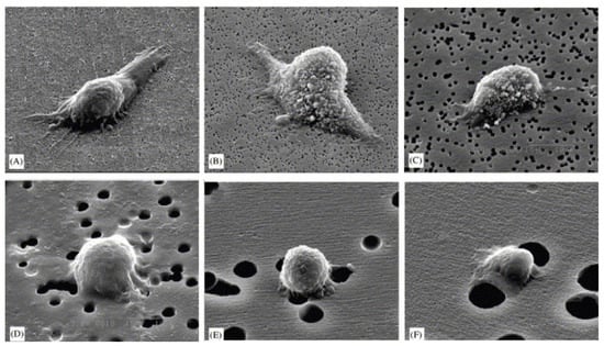 SEM images of adhesion of MG63 cells to the PC membrane surfaces with different surface roughnesses: (A) 0.2, (B) 0.4, (C) 1.0, (D) 3.0, (E) 5.0, and (F) 8.0 mm [78]. © Elsevier, 2004.