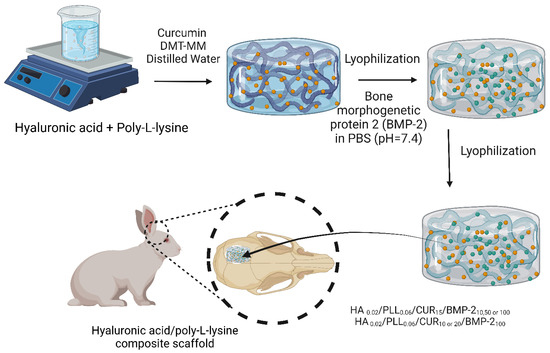 Hyaluronic acid has been reportedly crosslinked to hydrogel-based composites loaded with bioactive molecules for BTE applications (Figure 7). A hyaluronic acid/poly-L-lysine composite scaffold loaded with curcumin and BMP-2 was prepared. In vitro studies on MG63 osteosarcoma cells revealed that the composite scaffold allowed the sustained release of curcumin and BMP-2 over a 28-day period and marked proliferation and osteogenic differentiation of MG63 cells. In vivo evaluations of defects in rabbit skulls confirmed the remarkable synergistic bone healing effects between curcumin and BMP-2 [130].