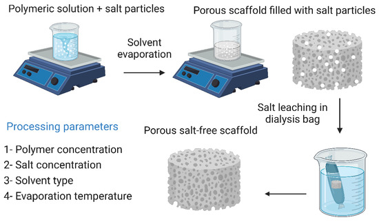 Solvent casting and particulate leaching yields highly porous frameworks with controllable pore sizes. Briefly, a polymeric material is dissolved in a suitable solvent along with salt particles of a known size, then the solvent is evaporated, leaving the salt particles in the polymer matrix. The salt particles are then leached out by immersing the polymer matrix in distilled water, resulting in a highly porous scaffold whose pores have the same dimensions as the salt particles. This technique has the advantage of being easy to perform and does not require sophisticated equipment. In addition, the malleability of the pore size makes it easy to produce structures that resemble natural bone tissue, which increases the biomimicry of the obtained scaffold [13,218]. Cao et al. [98] reported that they fabricated three-dimensional PGA/β-TCP composite scaffolds by solvent casting and particle leaching techniques. The fabricated scaffolds exhibited high porosity and interconnectivity of pores. In in vivo tests to evaluate their ability to reconstruct severe bone damage to the medial epicondyles of the femur of rats, imaging, and histological studies showed that new bone tissue began to form 14 days after implantation and bone formation was complete after 30 days. By day 90, the bone replacement was complete. However, this technique has several disadvantages, including the inability to construct more complex geometries, and the remaining solvent may have cytotoxic effects on cells, reducing the overall biocompatibility of the scaffold [98,221]. The solvent casting and particulate leaching technique along with its processing parameters are illustrated in Figure 9.