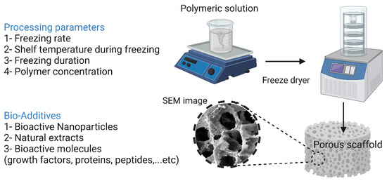 Freeze-drying involves freezing a polymeric solution via liquid nitrogen until the solvent completely evaporates. This technique is very advantageous when heat-sensitive biomolecules are incorporated into the scaffold, as high temperatures can lead to a reduction or total loss of their biological activity. In addition, this technique makes it relatively easy to control the pore size by manipulating the freezing conditions [19]. Xu et al. [222] reported the preparation of a bioglass–collagen–phosphatidylserine composite scaffold by freeze-drying. As reported by the authors, the scaffold had an average pore size of 300 μm with relatively high interconnectivity. Phosphatidylserine is able to form stable complexes with both calcium and phosphate, leading to the formation of HAp nuclei, a property unique to most phospholipids. This ability to form HAp nuclei is a major contributor to its use in bone regeneration. In in vitro tests with rat MSCs, after 21 days of cultivation on the scaffold, the cells began to proliferate and showed osteogenic behavior. In vivo evaluations on rats’ femurs showed that the scaffold was both biocompatible and osteoconductive after six weeks of implantation. However, the use of the freeze-drying technique in BTE has some shortcomings, such as the use of an organic solvent that may have cytotoxic effects on cells, the high energy requirement, the extremely time-consuming procedure, and, most importantly, the formation of miniature pores (in the range of 15 to 35 μm) with irregular morphology [179]. Changing the freezing conditions could provide a solution to the last problem, since varying the freezing temperature (−10 °C to −70 °C) and introducing an annealing step greatly increases the ice crystal growth rate. As reported by Murphy et al. [70], the application of these modifications resulted in an increase in the pore size of collagen–glycosaminoglycan scaffolds to 85–325 μm. The freeze-drying technique along with its processing parameters and additives are illustrated in Figure 10.