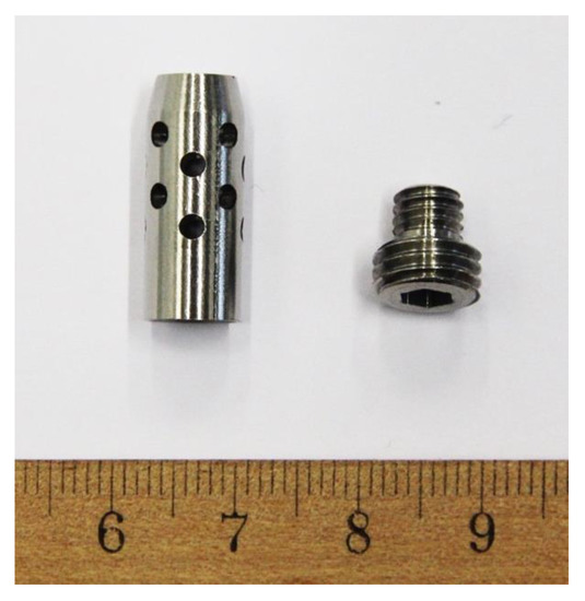 AISI 316 L stainless steel device developed to induce infection in sheep. It consists of a cylindrical hollow stainless-steel plug 20 mm long and 8 mm in diameter. The wall contains 16 holes distributed in four layers, each with four holes at 90° from each other for communication with the outside environment. At one end of the implant a locking screw is placed, which simultaneously accesses the implant cavity and allows its attachment to the bone.