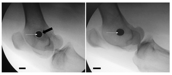 Presence of a radiolucent halo (black arrow) in the periphery of the implant (white arrows) in an animal of osteomyelitis group (left image), as opposed to the absence of a halo in the control group (right image). Scale bar = 1 cm.