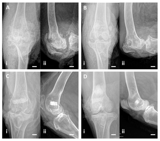 (A) In Group A animals, where the osteomyelitis was not treated, an irregular bone cavity is visible, associated with joint destruction. (B) In Group B animals, where HEPHAPC was placed (without vancomycin), the biomaterial is surrounded by a radiolucent halo. In some places, the biomaterial is visible outside the cavity initially created, demonstrating its non-integration. (C) In Group C animals, implanted with V-HEPHAPC, the biomaterial is integrated, without a radiolucent halo and without extravasation, very similar to the images of Group D. (D) In the animals in which the biomaterial was implanted without previous infection (Group D), there is no radiolucency around the implant, showing osseointegration. Scale bar = 1 cm, (i) Frontal view; (ii) Lateral view of the joint.