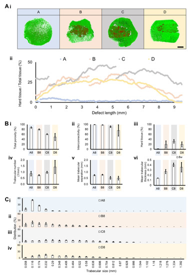 A section of the distal femoral metaphysis, including implanted material, was morphologically evaluated by micro-CT. To assess the invasion of host tissue within the implanted material, micro-CT was used. The hard material (colored red) represents the implanted ceramic material, and the soft material (colored green) is the host extracellular matrix found in the defect site. To distinguish both, an X-ray attenuation threshold was applied (soft/green = 30:100 a.a.; hard/red = 100: 255), revealing a larger invasion of host tissue in Groups C and D over 8 weeks. (Figure 5Ai). The identification of the implanted hydroxyapatite is possible not only due to its characteristic shape as porous ceramic granules are typically obtained through polymer sponge replication but also due to its stronger X-ray attenuation than native bone. Group A is a control group with no implanted material. To analyze the integration of the implant in the host tissue, a 2D micro-CT analysis along the Z-axis (defect depth) was performed, which enabled layer-by-layer profiling of the defect zone and quantification of hard (implant) and soft (host tissue) composition. A continuous formation and integration of tissue connected to the implanted material was verified and quantified for Group D, followed by a similar but not continuous profile in B and C (Figure 5Aii). Accordingly, the total free space (total porosity) decreased from Group A to D, as well as the interconnectivity (Figure 5Bi,Bii). The denser material, corresponding to the implanted granules, increased from A to D because A had no implanted material. Overall, the implanted material was still present in the different groups (B to D) at 8 weeks (Figure 5Biii). The trabecular number per millimeter, which is a relevant indicator of trabecular integrity and new trabecular formation, generally increased from A to D, where Group C (the condition with infection, with antibiotics and material) was the most similar condition to control Group D (the condition without infection, with material without antibiotics), as observed in Figure 5Biv. Following the same trend, while the mean trabecular separation (free space in between trabeculae) was decreased in Groups C and D, the mean trabecular thickness was increased in these two conditions compared to A and B (Figure 5Bv,Bvi). In Figure 5C, the distribution of the trabecular thickness is represented per average size, showing that a higher concentration of thin trabeculae was present in Groups A and, in contrast to C and D, where the distribution tended to result in larger trabecular thickness.