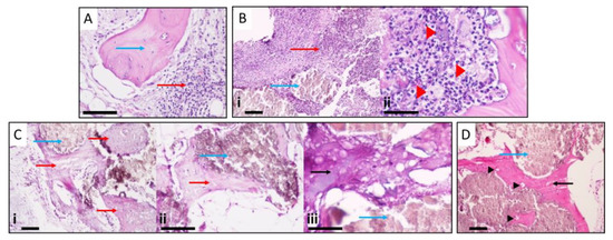 (A) Presence of mononuclear inflammatory infiltrate compatible with chronic osteomyelitis and some foci of the polymorphonuclear cell infiltrate (red arrow), close to or surrounding bone tissue (blue arrow), suggesting acute infection. (B) The predominance of polymorphonuclear and suppuration (red arrow) around biomaterial (blue arrow). Giant cells are also visible (red arrowheads), suggesting a foreign body reaction. (C) V-HEPHAPC (blue arrows) is surrounded by a chondroid matrix (red arrow) and bone, with osteocyte visualization. At higher magnification, very little inflammatory infiltrate and ossification can be clearly seen. In the X200 and X400 images, the biomaterial (blue arrow) is surrounded by chondroid (red arrow) and bone matrix (black arrow) with an area of still-immature bone formation. (D) At the periphery of the material (blue arrow), the appearance of bone tissue (black arrow) with numerous osteocytes (black arrowheads) is clearly visible, with zones of calcification and bone maturation. Scale bars = 500 μm (Ci); 100 μm (A,Bi,Cii,Ciii,D)); and 50 μm (Bii).