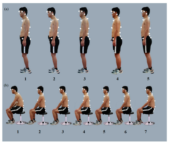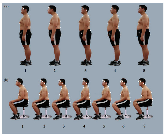 Sitting and standing postures of the first healthy volunteer with a BMI of 21 kg/m2: (a) the five determined standing postures; (b) the seven determined sitting postures.