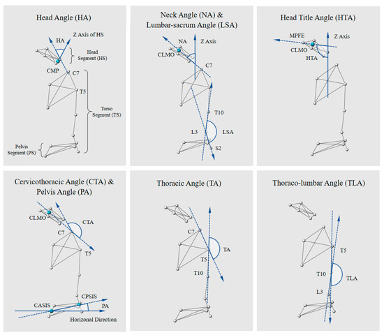 - Head Angle: The Euler angle between the vertical vector of the head segment and torso segment, reflecting the tilt of the head in the sagittal plane.